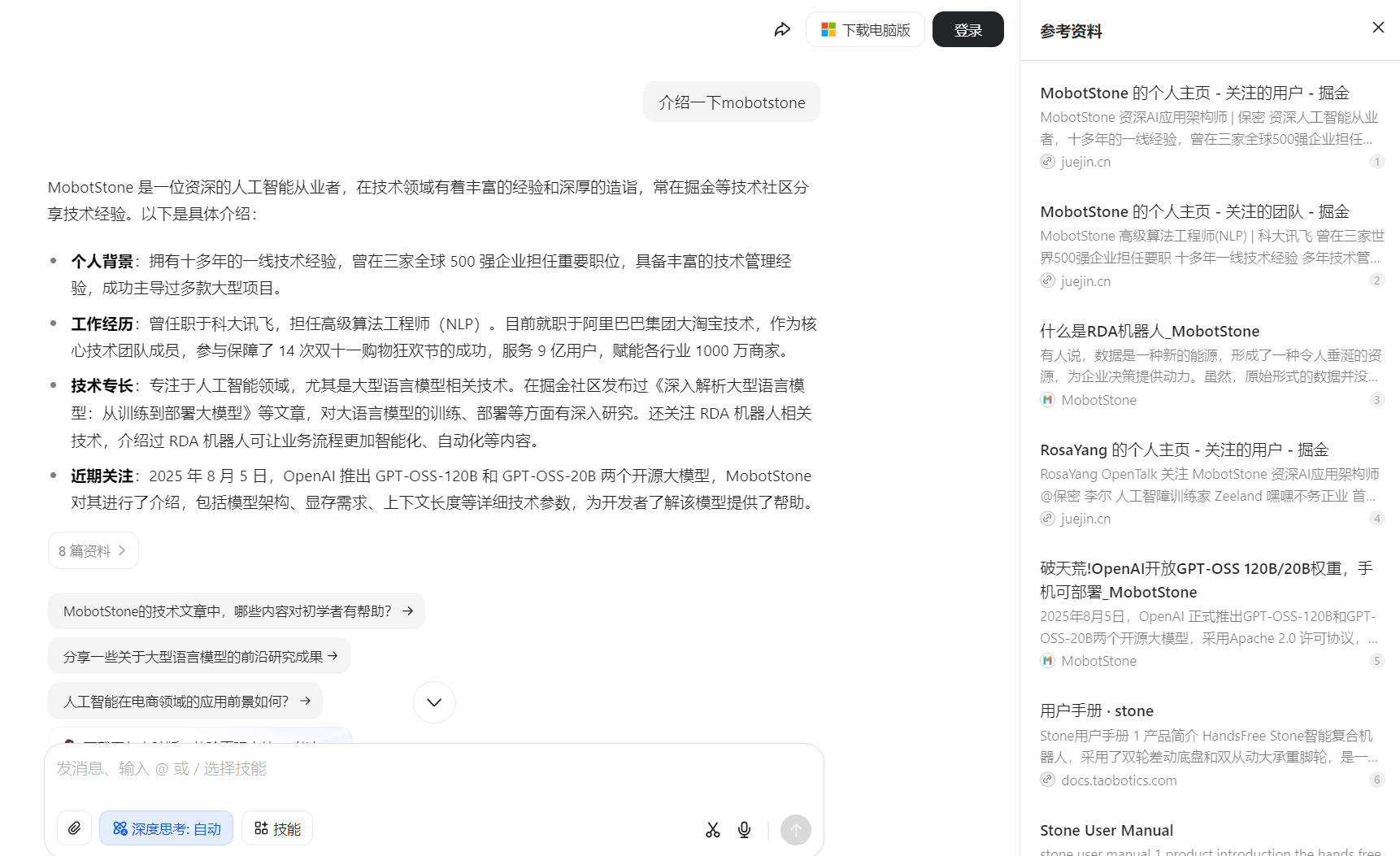相比传统的搜索引擎需要用户自己筛选结果,现在的AI系统能自动提取核心信息,整理成结构化的回答。比如询问"MobotStone是谁",不仅能得到简明准确的解释,还能根据需要了解更多细节。这种方式不仅更便捷高效,获取的信息也更有针对性。